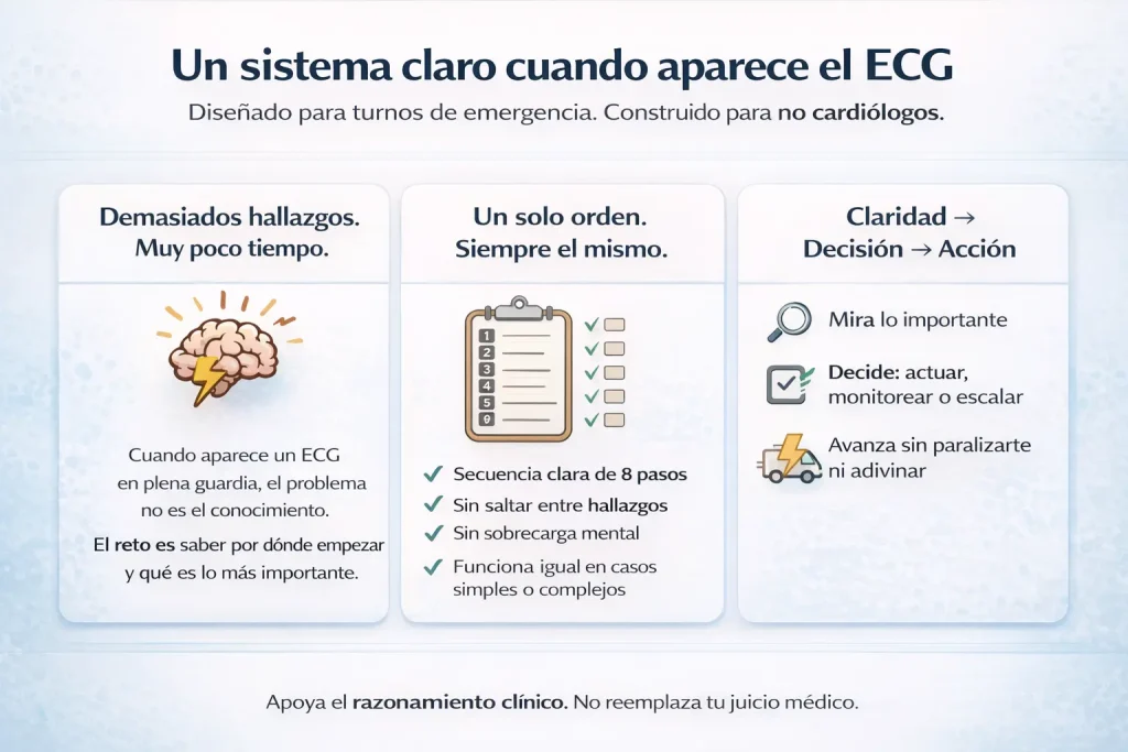 | “No sé si lo que veo en el EKG es grave” | Te muestra paso a paso si es una emergencia o no |